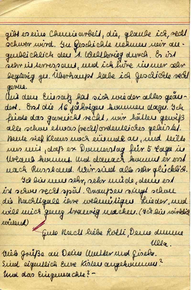 Mit dem Einsatz hat sich wieder alles geändert. Erst die 16 jährigen kommen dazu. Ich finde das garnicht recht, wir hätten gewiß alle schon etwas ordentliches geleistet. Heute rief Klaus noch einmal an, und teilte uns mit, daß er Donnerstag für 5 Tage in Urlaub kommt. Und danach kommt er erst nach Russland. Wir sind alle sehr glücklich.