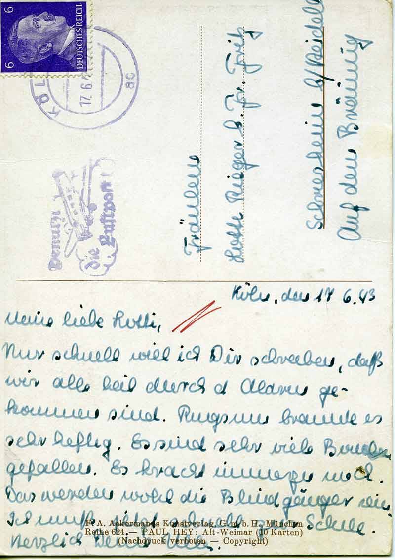 Nur schnell will ich Dir schreiben, daß wir alle heil durch d. Alarm gekommen sind. Ringsum brannte es sehr heftig. Es sind sehr viele Bomben gefallen. Es kracht immerzu noch. Das werden wohl die Blindgänger sein. Ich muß jetzt schnell zur Schule.