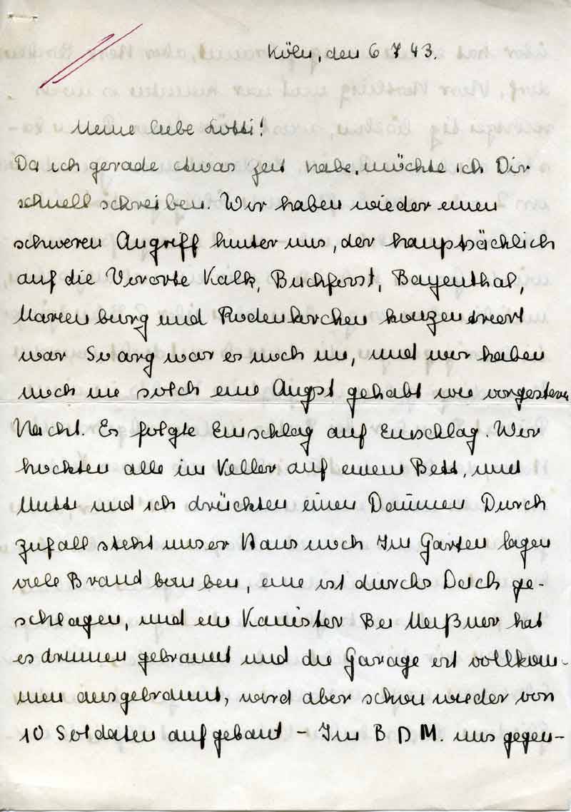 Da ich gerade etwas Zeit habe, möchte ich Dir schnell schreiben. Wir haben wieder einen schweren Angriff hinter uns, der hauptsächlich auf die Vororte Kalk, Buchforst, Bayenthal, Marienburg und Rodenkirchen konzentriert war. So arg war es auch nie, und wir haben noch nie solch eine Angst gehabt wie vorgestern Nacht. Es folgte Einschlag auf Einschlag. Wir hockten alle im Keller auf einem Bett, und Mutti und ich drückten einen Daumen. Durch Zufall steht unser Haus noch. Im Garten lagen viele Brandbomben, eine ist durchs Dach geschlagen, und ein Kanister. Bei Meißner hat es drinnen gebrannt und die Garage ist vollkommen ausgebrannt, wird aber schon wieder von 10 Soldaten aufgebaut. – Im BDM. uns gegen-