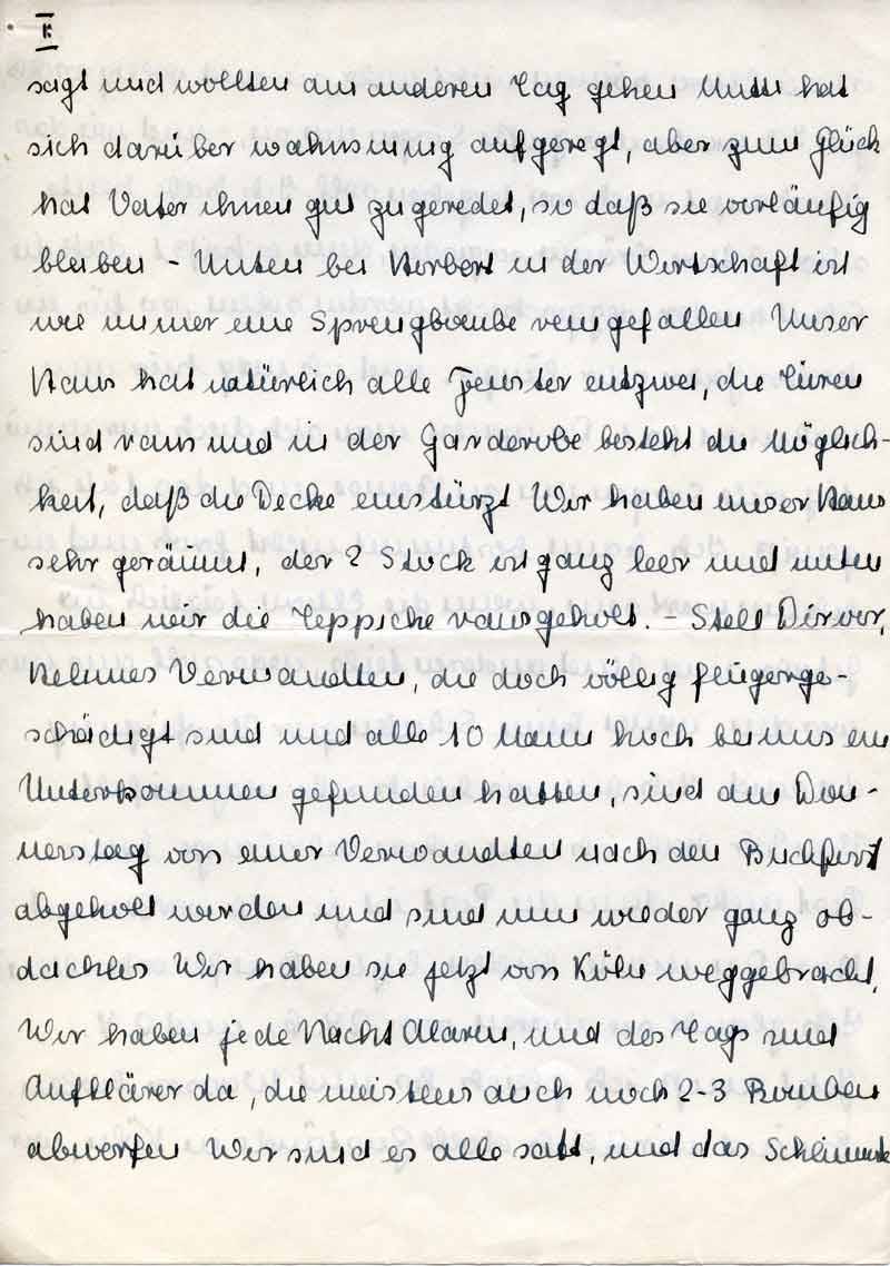 sagt und wollten am anderen Tag gehen. Mutti hat sich darüber wahnsinnig aufgeregt, aber zum Glück hat Vater ihnen gut zugeredet, so daß sie vorläufig bleiben. – Unten bei Herbert in der Wirtschaft ist wie immer eine Sprengbombe reingefallen. Unser Haus hat natürlich alle Fenster entzwei, die Türen sind raus und in der Garderobe besteht die Möglichkeit, daß die Decke einstürzt. Wir haben unser Haus sehr geräumt, der 2. Stock ist ganz leer und unten haben wir die Teppiche rausgeholt. – Stell Dir vor, Helenes Verwandten, die doch völlig fliegergeschädigt sind und alle 10 Mann hoch bei uns ein Unterkommen gefunden hatten, sind am Donnerstag von einer Verwandten nach den Buchforst abgeholt worden und sind nun wieder ganz obdachlos. Wir haben sie jetzt von Köln weggebracht. Wir haben jede Nacht Alarm, und des Tags sind Aufklärer da, die meistens auch noch 2-3 Bomben abwerfen. Wir sind es alle satt, und das Schlimmste