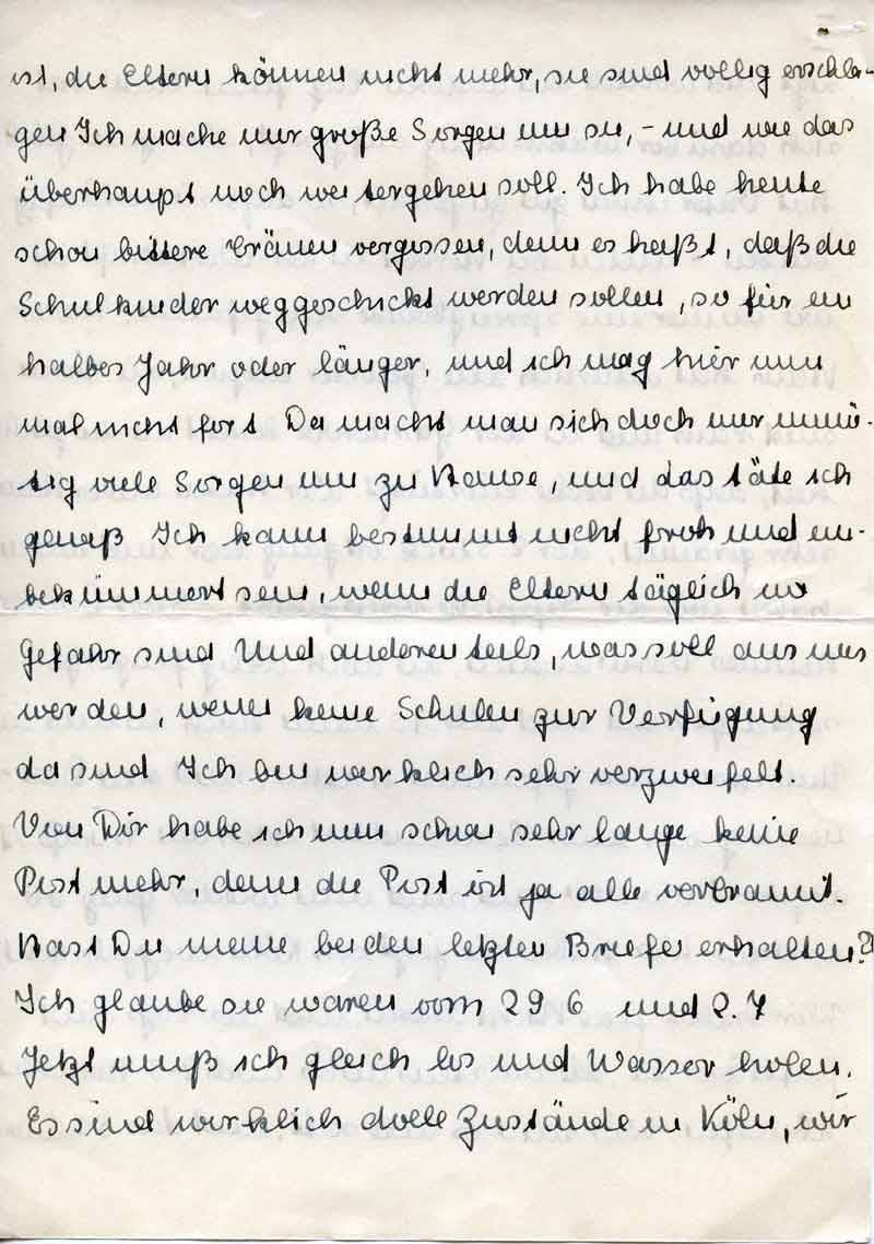 ist, die Eltern können nicht mehr, sie sind völlig erschlagen. Ich mache mir große Sorgen um sie, - und wie das überhaupt noch weitergehen soll. Ich habe heute schon bittere Tränen vergossen, denn es heißt, daß die Schulkinder weggeschickt werden sollen, so für ein halbes Jahr oder länger, und ich mag hier nun mal nicht fort. Da macht man sich doch nur unnötig viele Sorgen um zu Hause, und das täte ich gewiß. Ich kann bestimmt nicht froh und unbekümmert sein, wenn die Eltern täglich in Gefahr sind. Und anderenteils, was soll aus uns werden, wenn keine Schulen zur Verfügung da sind. Ich bin wirklich sehr verzweifelt. Von Dir habe ich nun schon sehr lange keine Post mehr, denn die Post ist ja alle verbrannt. Hast Du meine beiden letzten Briefe erhalten? Ich glaube sie waren vom 29.6. und 2.7. Jetzt muß ich gleich los und Wasser holen. Es sind wirklich dolle Zustände in Köln, wir