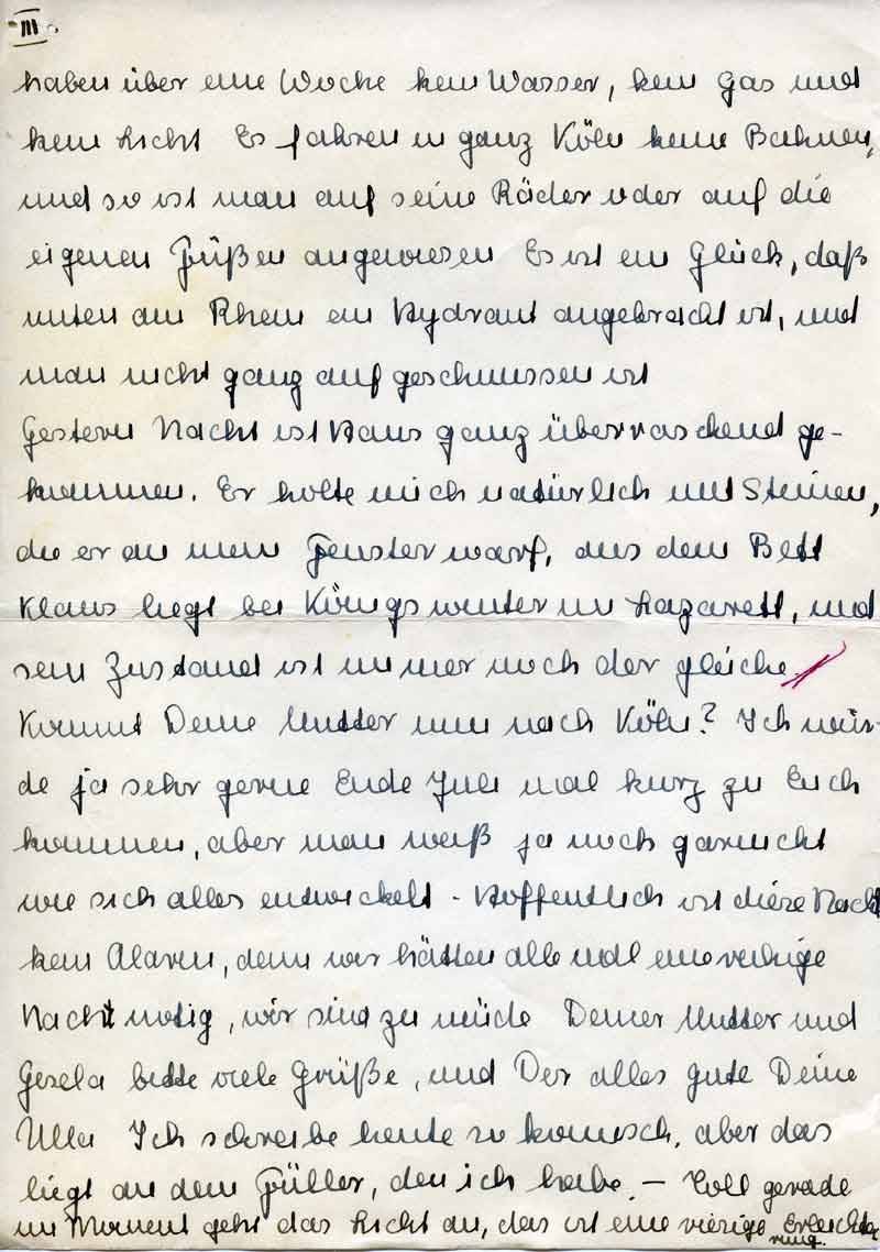 Kommt Deine Mutter nun nach Köln? Ich würde ja sehr gerne Ende Juli mal kurz zu Euch kommen, aber man weiß ja noch garnicht wie sich alles entwickelt. - Hoffentlich ist diese Nacht kein Alarm, denn wir hätten alle mal eine ruhige Nacht nötig, wir sind zu müde. Deiner Mutter und Gisela bitte viele Grüße, und Dir alles gute Deine Ulla. Ich schreibe heute so komisch, aber das liegt an dem Füller, den ich habe. – Toll gerade im Moment geht das Licht an, das ist eine riesige Erleichterung.