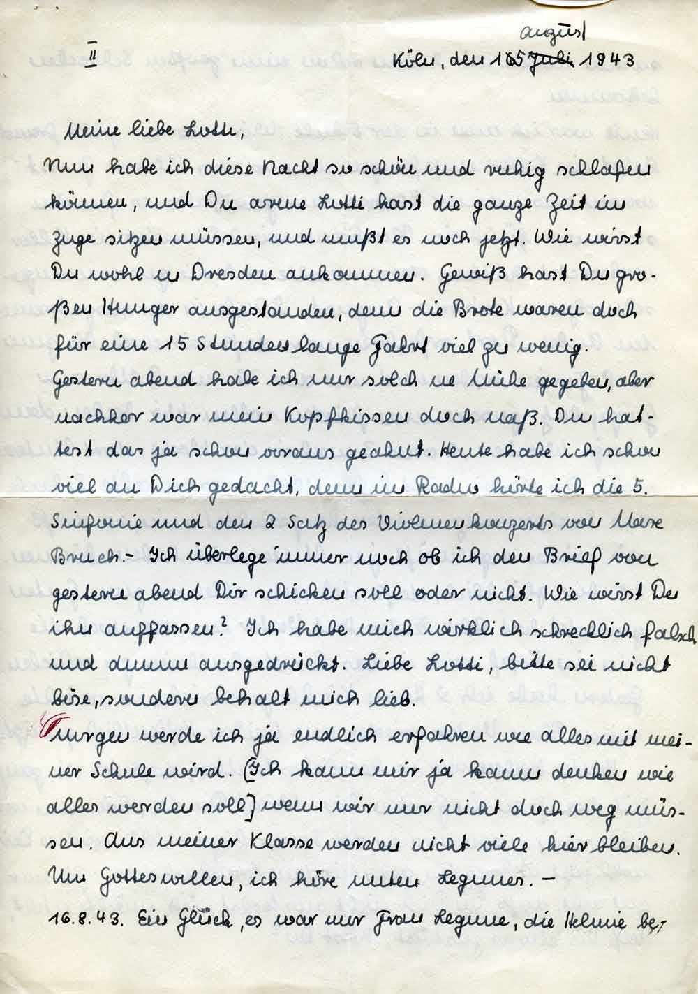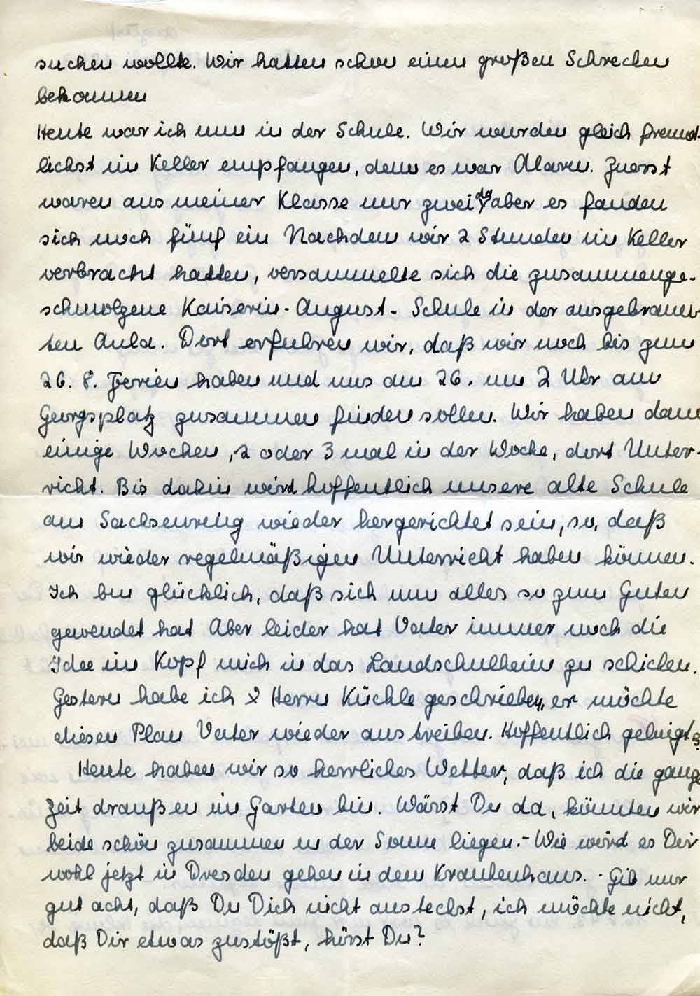 Heute war ich nun in der Schule. Wir wurden gleich freundlichst im Keller empfangen, denn es war Alarm. Zuerst waren aus meiner Klasse nur zwei da, aber es fanden sich noch fünf ein. Nachdem wir 2 Stunden im Keller verbracht hatten, versammelte sich die zusammengeschmolzene Kaiserin-August-Schule in der ausgebrannten Aula. Dort erfuhren wir, daß wir noch bis zum 26.8. Ferien haben und uns am 26. um 2 Uhr am Georgsplatz zusammen finden sollen. Wir haben dann einige Wochen, 2 oder 3 mal in der Woche, dort Unterricht. Bis dahin wird hoffentlich unsere alte Schule am Sachsenring wieder hergerichtet sein, so, daß wir wieder regelmäßigen Unterricht haben können. Ich bin glücklich, daß sich nun alles so zum Guten gewendet hat. Aber leider hat Vater immer noch die Idee im Kopf mich in das Landschulheim zu schicken. Gestern habe ich Herrn Küchle geschrieben, er möchte diesen Plan Vater wieder austreiben. Hoffentlich gelingt es.