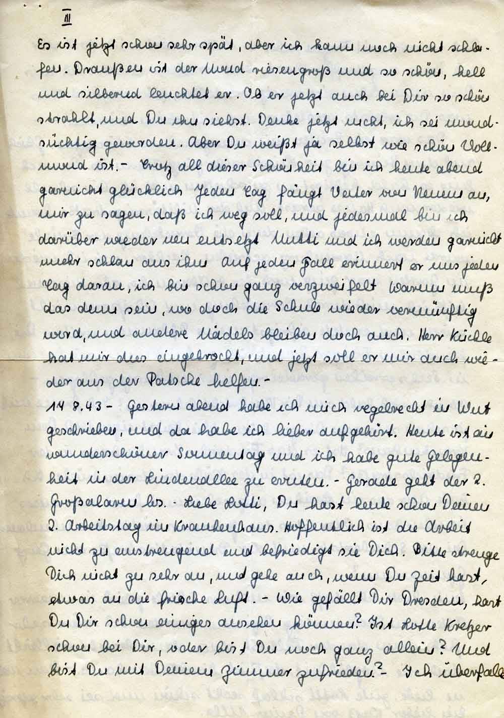 17.8.43 – Gestern abend habe ich mich regelrecht in Wut geschrieben, und da habe ich lieber aufgehört. Heute ist ein wunderschöner Sonnentag und ich habe gute Gelegenheit in der Lindenallee zu ernten. – Gerade geht der 2. Großalarm los. – Liebe Lotti, Du hast heute schon Deinen 2. Arbeitstag im Krankenhaus. Hoffentlich ist die Arbeit nicht zu anstrengend und befriedigt sie Dich. Bitte strenge Dich nicht zu sehr an, und gehe auch, wenn Du Zeit hast, etwas an die frische Luft. – Wie gefällt Dir Dresden, hast Du Dir schon einiges ansehen können? Ist Lotte Kretzer schon bei Dir, oder bist Du noch ganz allein? Und bist Du mit Deinem Zimmer zufrieden? – Ich überfalle