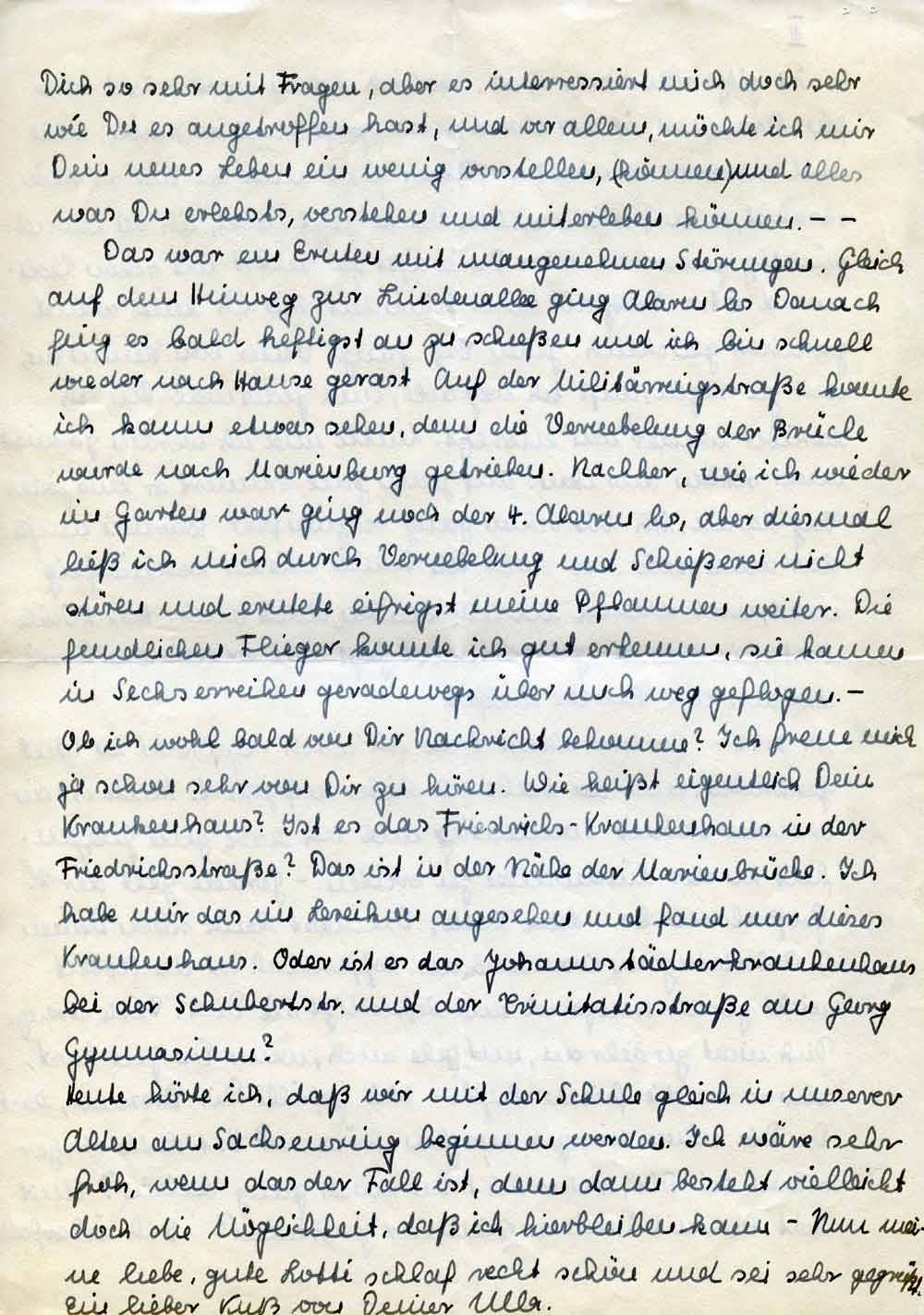Heute hörte ich, daß wir mit der Schule gleich in unserer Alten am Sachsenring beginnen werden. Ich wäre sehr froh, wenn das der Fall isst, denn dann besteht vielleicht doch die Möglichkeit, daß ich hierbleiben kann. – Nun meine liebe, gute Lotti schlaf recht schön und sei sehr gegrüßt.