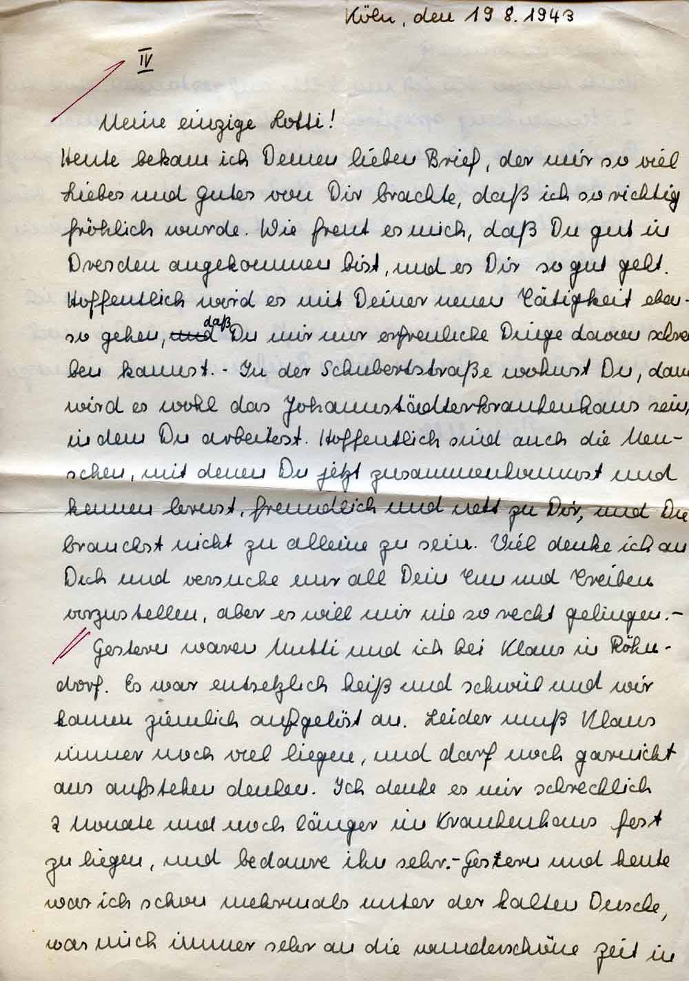 Heute bekam ich Deinen lieben Brief, der mir so viel Liebes und Gutes von Dir brachte, daß ich so richtig fröhlich wurde. Wie freut es mich, daß Du gut in Dresden angekommen bist, und es Dir so gut geht. Hoffentlich wird es mit Deiner neuen Tätigkeit ebenso gehen, daß Du mir nur erfreuliche Dinge davon schreiben kannst. – In der Schubertstraße wohnst Du, dann wird es wohl das Johannstädterkrankenhaus sein, in dem Du arbeitest. Hoffentlich sind auch die Menschen, mit denen Du jetzt zusammenkommst und kennen lernst, freundlich und nett zu Dir, und Du brauchst nicht zu alleine zu sein. Viel denke ich an Dich und versuche mir all Dein Tun und Treiben vorzustellen, aber es will mir nie so recht gelingen. -