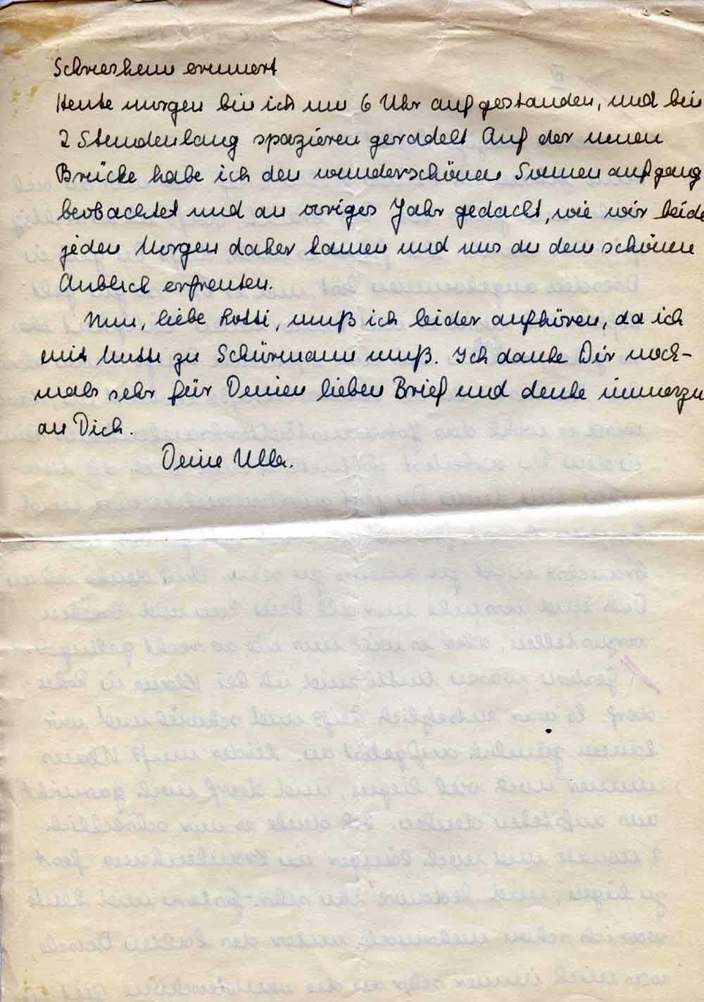 Nun, liebe Lotti, muß ich leider aufhören, da ich mit Mutti zu Schürmann muß. Ich danke Dir nochmals sehr für Deinen lieben Brief und denke immerzu an Dich.