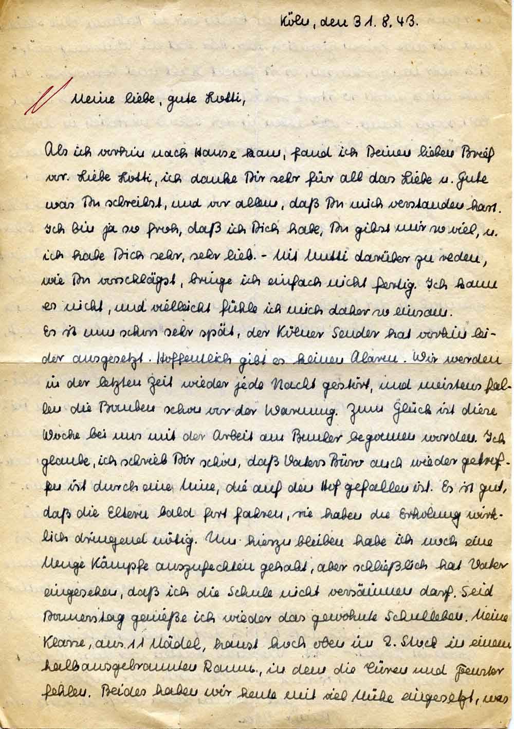 Es ist nun schon sehr spät, der Kölner Sender hat vorhin leider ausgesetzt. Hoffentlich gibt es keinen Alarm. Wir werden in der letzten Zeit wieder jede Nacht gestört, und meistens fallen die Bomben schon vor der Warnung. Zum Glück ist diese Woche bei uns mit der Arbeit am Bunker begonnen worden. Ich glaube, ich schrieb Dir schon, daß Vaters Büro auch wieder getroffen ist durch eine Mine, die auf den Hof gefallen ist. Es ist gut, daß die Eltern bald fort fahren, sie haben die Erholung wirklich dringend nötig. Um hierzubleiben habe ich noch eine Menge Kämpfe auszufechten gehabt, aber schließlich hat Vater eingesehen, daß ich die Schule nicht versäumen darf. Seid Donnerstag genieße ich wieder das gewohnte Schulleben. Meine Klasse, aus 11 Mädel, haust hoch oben im 2. Stock in einem halbausgebrannten Raum, in dem die Türen und Fenster fehlen. Beides haben wir heute mit viel Mühe eingesetzt, was