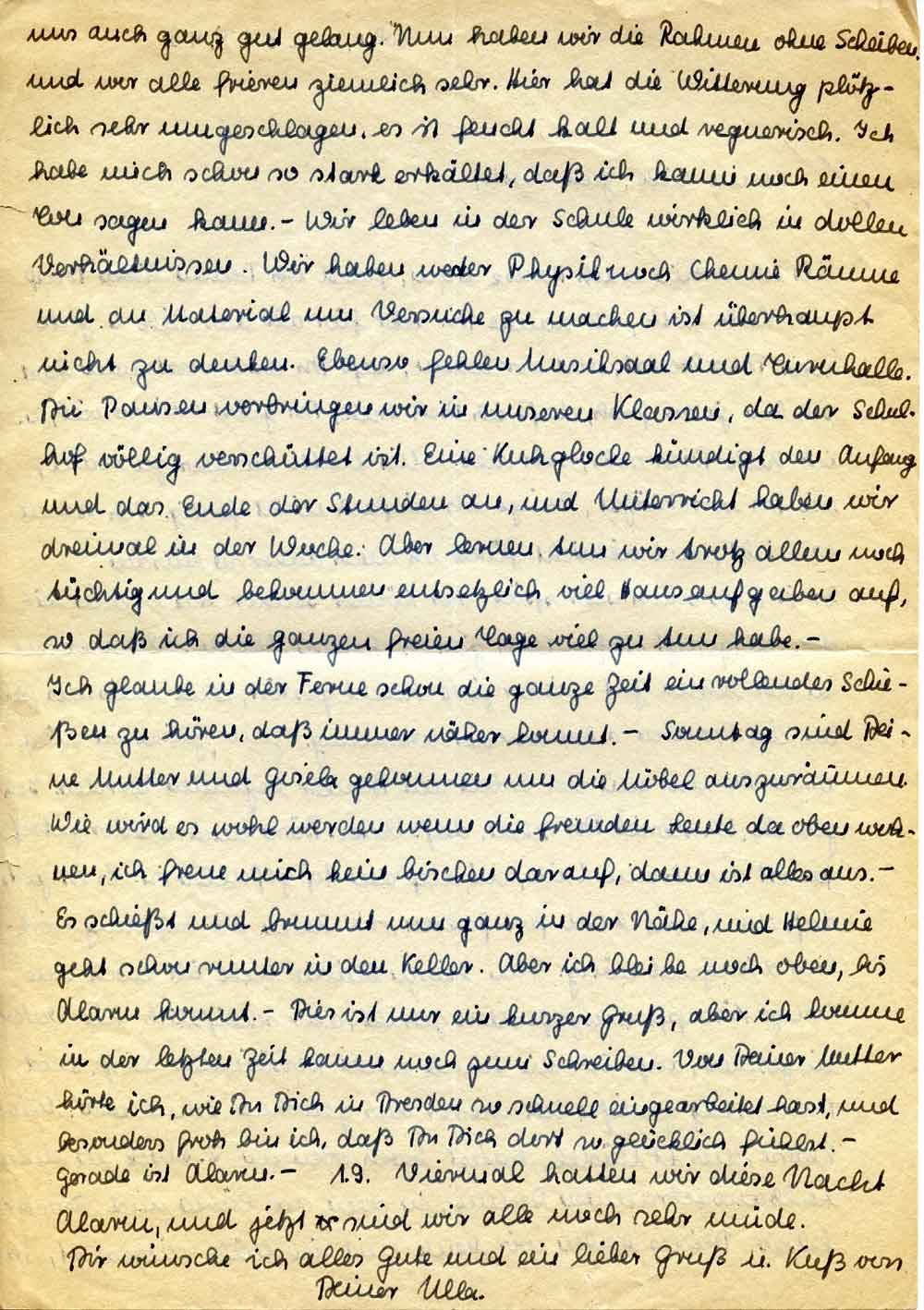 uns auch ganz gut gelang. Nun haben wir die Rahmen ohne Scheiben, und wir alle frieren ziemlich sehr. Hier hat die Witterung plötzlich sehr umgeschlagen, es ist feucht kalt und regnerisch. Ich habe mich schon so stark erkältet, daß ich kaum noch einen Ton sagen kann. – Wir leben in der Schule wirklich in dollen Verhältnissen. Wir haben weder Physik noch Chemie Räume und an Material um Versuche zu machen ist überhaupt nicht zu denken. Ebenso fehlen Musiksaal und Turnhalle. Die Pausen verbringen wir in unseren Klassen, da der Schulhof völlig verschüttet ist. Eine Kuhglocke kündigt den Anfang und das Ende der Stunden an, und Unterricht haben wir dreimal in der Woche. Aber lernen tun wir trotz allem noch tüchtig und bekommen entsetzlich viel Hausaufgaben auf, so daß ich die ganzen freien Tage viel zu tun habe. -