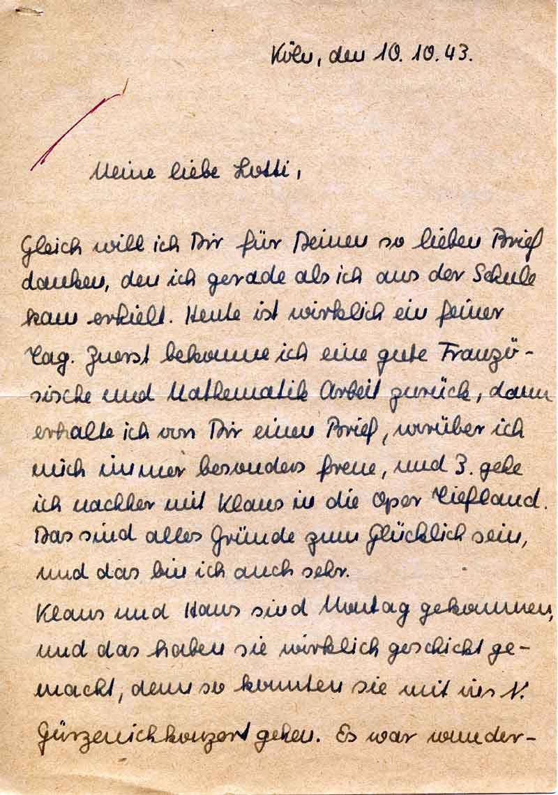 Gleich will ich Dir für Deinen so lieben Brief danken, den ich gerade als ich aus der Schule kam erhielt. Heute ist wirklich ein feiner Tag. Zuerst bekomme ich eine gute Französische und Mathematik Arbeit zurück, dann erhalte ich von Dir einen Brief, worüber ich mich immer besonders freue, und 3. gehe ich nachher mit Klaus in die Oper Tiefland. Das sind alles Gründe zum Glücklich sein, und das bin ich auch sehr.