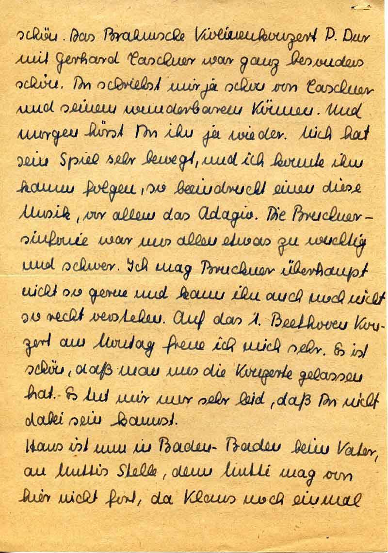 schön. Das Brahmsche Violinenkonzert D. Dur mit Gerhard Taschner war ganz besonders schön. Du schriebst mir ja schon von Taschner und seinem wunderbaren Können. Und morgen hörst Du ihn ja wieder. Mich hat sein Spiel sehr bewegt, und ich konnte ihm kaum folgen, so beeindruckt einen diese Musik, vor allem das Adagio. Die Brucknersinfonie war uns allen etwas zu wuchtig und schwer. Ich mag Bruckner überhaupt nicht so gerne und kann ihn auch noch nicht so recht verstehen. Auf das 1. Beethoven Konzert am Montag freue ich mich sehr. Es ist schön, daß man uns die Konzerte gelassen hat. Es tut mir nur sehr leid, daß Du nicht dabei sein kannst.