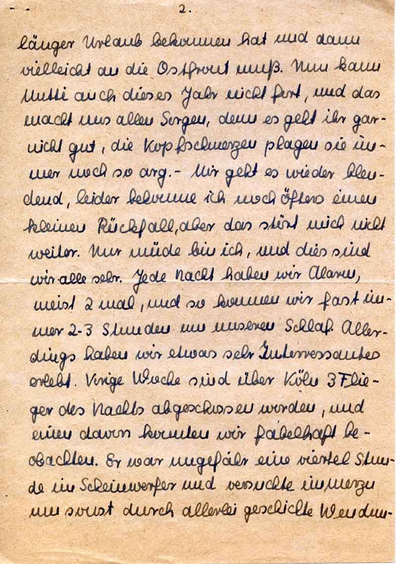 länger Urlaub bekommen hat und dann vielleicht an die Ostfront muß. Nun kann Mutti auch dieses Jahr nicht fort, und das macht uns allen Sorgen, denn es geht ihr garnicht gut, die Kopfschmerzen plagen sie immer noch so arg. – Mir geht es wieder blendend, leider bekomme ich noch öfters einen kleinen Rückfall, aber das stört mich nicht weiter. Nur müde bin ich, und dies sind wir alle sehr. Jede Nacht haben wir Alarm, meist 2 mal, und so kommen wir fast immer 2-3 Stunden um unseren Schlaf. Allerdings haben wir etwas sehr Interessantes erlebt. Vorige Woche sind über Köln 3 Flieger des Nachts abgeschossen worden, und einen davon konnten wir fabelhaft beobachten. Er war ungefähr eine viertel Stunde im Scheinwerfer und versuchte immerzu umsonst durch allerlei geschickte Wendun-