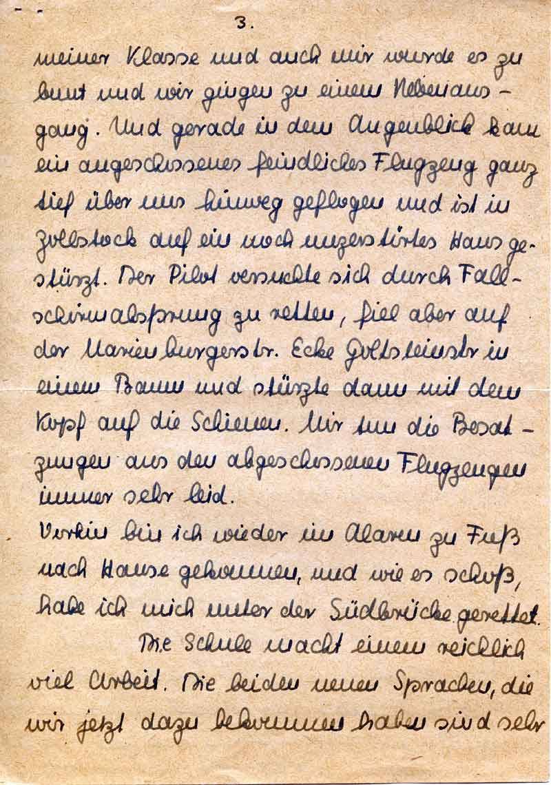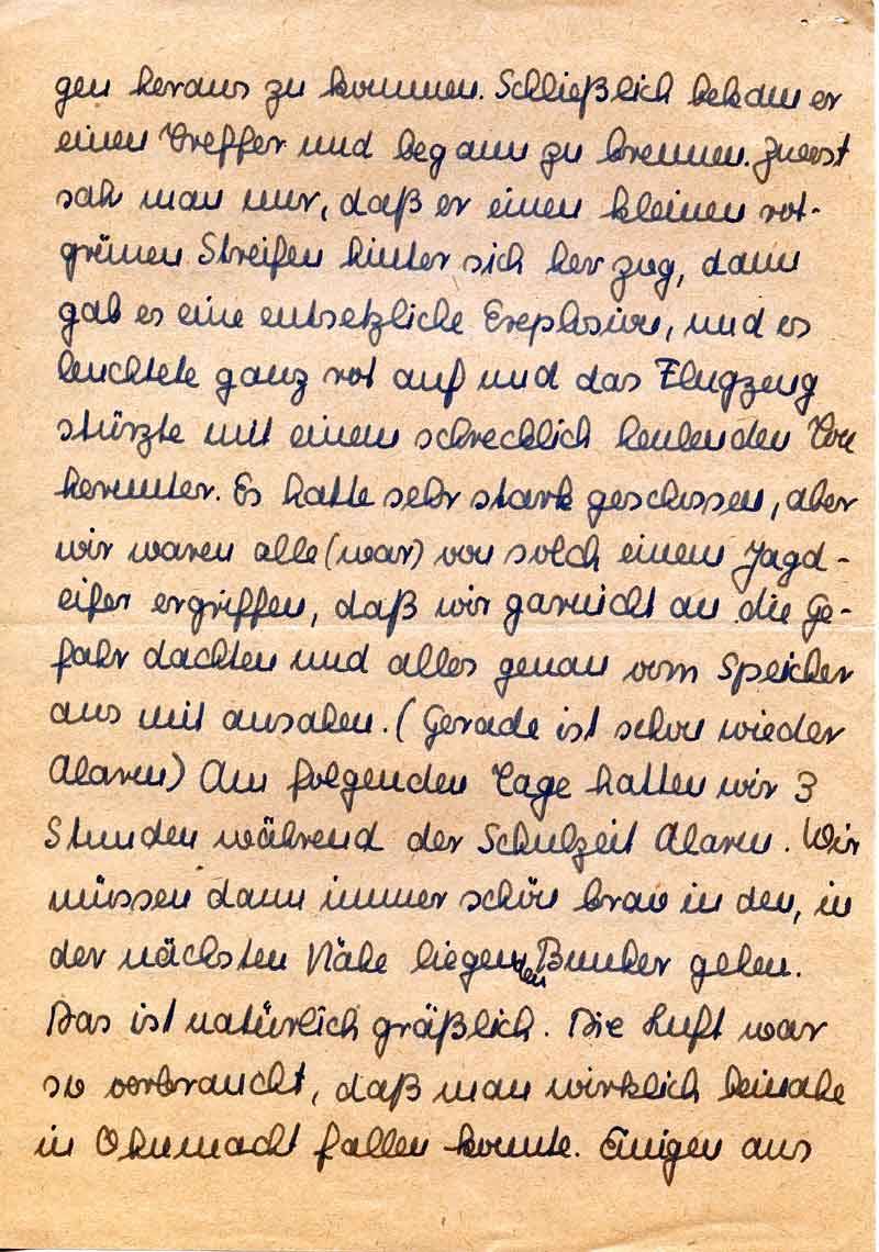 gen heraus zu kommen. Schließlich bekam er einen Treffer und begann zu brennen. Zuerst sah man nur, daß er einen kleinen rotgrünen Streifen hinter sich her zog, dann gab es eine entsetzliche Explosion, und es leuchtete ganz rot auf und das Flugzeug stürzte mit einem schrecklich heulenden Ton herunter. Es hatte sehr stark geschossen, aber wir waren alle von solch einem Jagdeifer ergriffen, daß wir garnicht an die Gefahr dachten und alles genau vom Speicher aus mit ansahen. (Gerade ist schon wieder Alarm) Am folgenden Tage hatten wir 3 Stunden während der Schulzeit Alarm. Wir müssen dann immer schön brav in den, in der nächsten Nähe liegenden Bunker gehen. Das ist natürlich gräßlich. Die Luft war so verbraucht, daß man wirklich beinahe in Ohnmacht fallen konnte. Einigen aus
