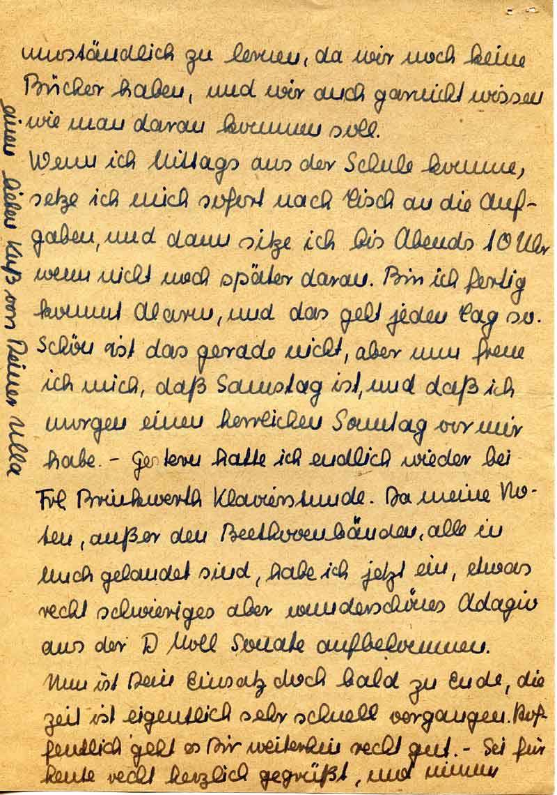 Wenn ich Mittags aus der Schule komme, setze ich mich sofort nach Tisch an die Aufgaben, und dann sitze ich bis Abends 10 Uhr wenn nicht noch später daran. Bin ich fertig kommt Alarm, und das geht jeden Tag so. Schön ist das gerade nicht, aber nun freue ich mich, daß Samstag ist, und daß ich morgen einen herrlichen Sonntag vor mir habe. – Gestern hatte ich endlich wieder bei Frl. Brinkwerth Klavierstunde. Da meine Noten, außer den Beethovenbänden, alle in Much gelandet sind, habe ich jetzt ein etwas recht schwieriges aber wunderschönes Adagio aus der D Moll Sonate aufbekommen.