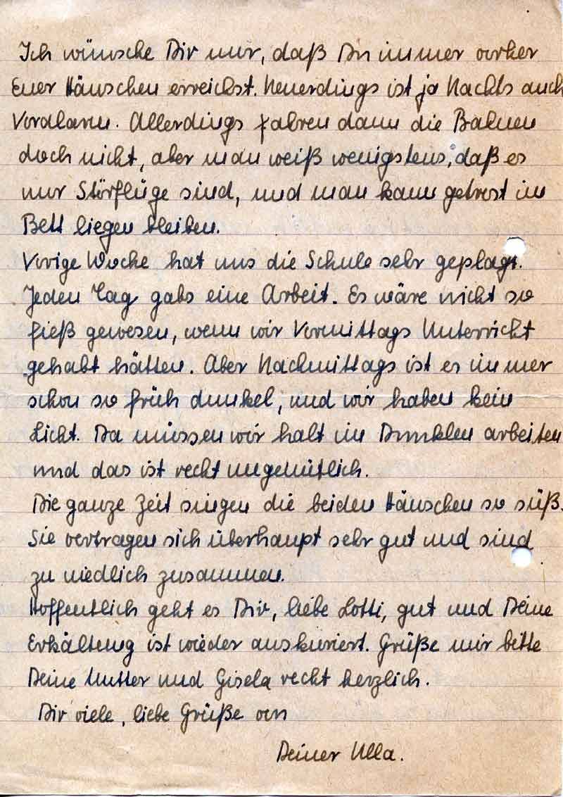 Vorige Woche hat uns die Schule sehr geplagt. Jeden Tag gabs eine Arbeit. Es wäre nicht so fieß gewesen, wenn wir Vormittags Unterricht gehabt hätten. Aber Nachmittags ist es immer schon so früh dunkel, und wir haben kein Licht. Da müssen wir halt im Dunklen arbeiten und das ist recht ungemütlich.