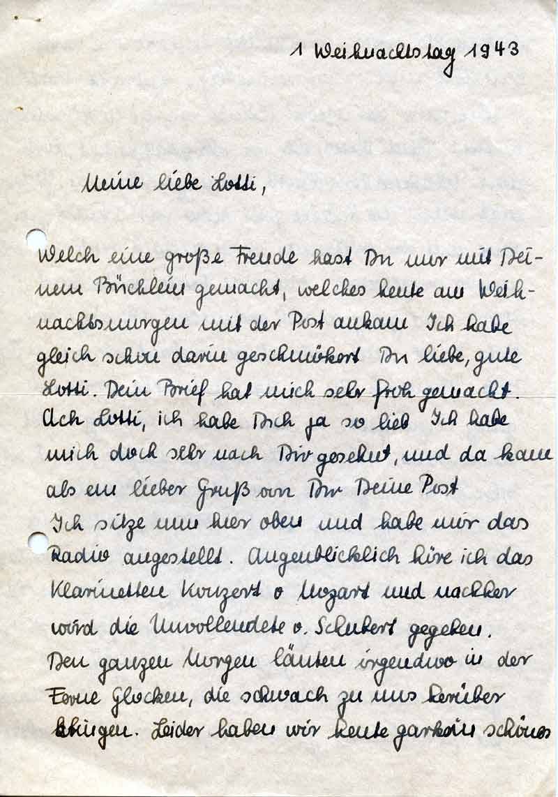 Welch eine große Freude hast Du mir mit Deinem Büchlein gemacht, welches heute am Weihnachtsmorgen mit der Post ankam. Ich habe gleich schon darin geschmökert. Du liebe, gute Lotti. Dein Brief hat mich sehr froh gemacht. Ach Lotti, ich habe Dich ja so lieb. Ich habe mich doch sehr nach Dir gesehnt, und da kam als ein lieber Gruß von Dir Deine Post.
