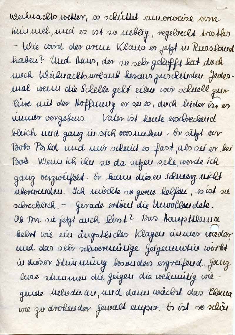 - Wie wird der arme Klaus es jetzt in Russland haben? Und Hans, der so sehr gehofft hat, doch noch Weihnachtsurlaub herauszuschinden. Jedesmal wenn die Schelle geht eilen wir schnell zur Türe mit der Hoffnung er sei es, doch leider ist es immer vergebens. Vater ist heute erschreckend bleich und ganz in sich versunken. Er sitzt vor Bobs Bild und mir scheint es fast, als sei er bei Bob. Wenn ich ihn so da sitzen sehe, werde ich ganz verzweifelt. Er kann diesen Schmerz nicht überwinden. Ich möchte so gerne helfen, es ist so schrecklich. – Gerade ertönt die Unvollendete. Ob Du sie jetzt auch hörst? Das Hauptthema kehrt wie ein ängstliches Klagen immer wieder, und das sehr schwermütige Geigenmotiv wirkt in dieser Stimmung besonders ergreifend. Ganz leise stimmen die Geigen die wehmütig wiegende Melodie an, und dann wächst das Thema wie zu drohender Gewalt empor. Es ist so schön