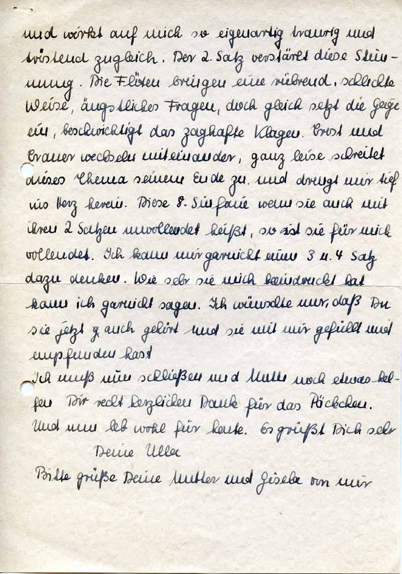 und wirkt auf mich so eigenartig traurig und tröstend zugleich. Der 2. Satz verstärkt diese Stimmung. Die Flöten bringen eine rührend, schlichte Weise, ängstliches Fragen, doch gleich setzt die Geige ein, beschwichtigt das zaghafte Klagen. Trost und Trauer wechseln miteinander, ganz leise schreitet dieses Thema seinem Ende zu, und dringt mir tief ins Herz herein. Diese 8. Sinfonie wenn sie auch mit ihren 2 Sätzen unvollendet heißt, so ist sie für mich vollendet. Ich kann mir garnicht einen 3. u. 4. Satz dazu denken. Wie sehr sie mich beeindruckt hat kann ich garnicht sagen. Ich wünschte nur, daß Du sie jetzt auch gehört und sie mit mir gefühlt und empfunden hast.