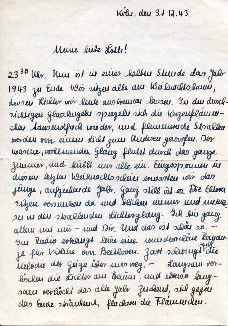 23.30 Uhr. Nun ist in einer halben Stunde das Jahr 1943 zu Ende. Wir sitzen alle am Weihnachtsbaum, dessen Lichter wir heute ausbrennen lassen. In den durchsichtigen Glaskugeln spiegeln sich die Kerzenflämmchen tausendfach wieder, und flimmernde Strahlen werden von einem Licht zum Anderen geworfen. Der warme, wohltuende Glanz flutet durch das ganze Zimmer, und hüllt uns alle ein. Eingesponnen in diesen letzten Weihnachtsschein erwarten wir das junge, aufziehende Jahr. Ganz still ist es. Die Eltern sitzen versunken da und blicken immer und immerzu in den strahlenden Lichterglanz. Ich bin ganz allein mit mir – und Dir. Und das ist schön so. -