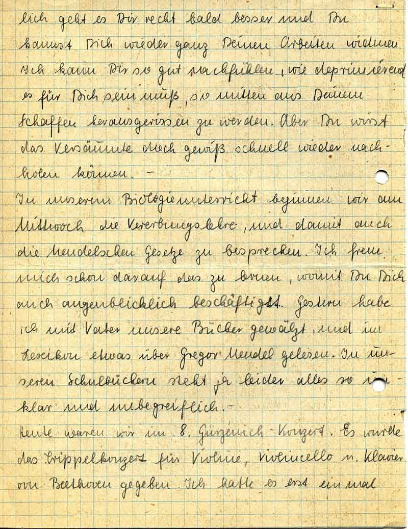 In unserem Biologieunterricht beginnen wir am Mittwoch die Vererbungslehre, und damit auch die Mendelschen Gesetze zu besprechen. Ich freue mich schon darauf das zu lernen, womit Du Dich auch augenblicklich beschäftigst. Gestern habe ich mit Vater unsere Bücher gewälzt, und im Lexikon etwas über Gregor Mendel gelesen. In unseren Schulbüchern steht ja leider alles so unklar und unbegreiflichz. -