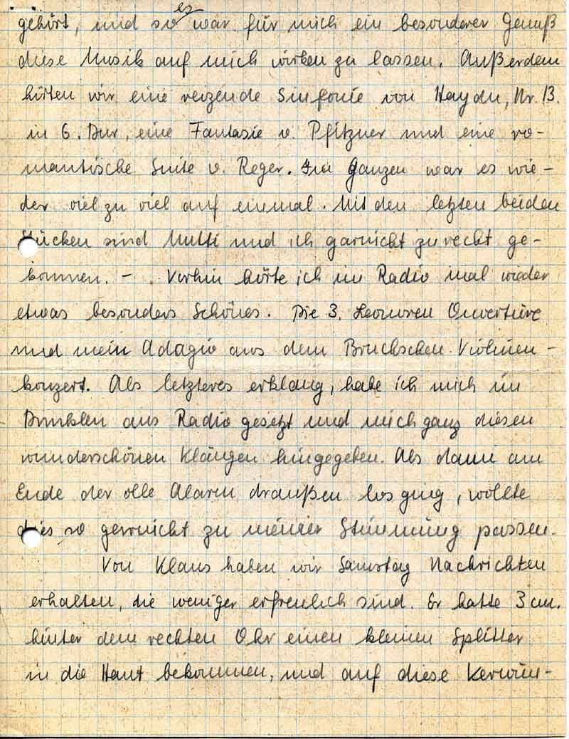 gehört, und so war es für mich ein besonderer Genuß diese Musik auf mich wirken zu lassen. Außerdem hörten wir eine reizende Sinfonie von Haydn, Nr. 13. in d-Dur, eine Fantasie v. Pfitzner und eine romantische Suite v. Reger. Im Ganzen war es wieder viel zu viel auf einmal. Mit den letzten beiden Stücken sind Mutti und ich garnicht zu recht gekommen. – Vorhin hörte ich im Radio mal wieder etwas besonders Schönes. Die 3. Leonoren Ouvertüre und mein Adagio aus dem Bruchschen Violinenkonzert. Als letzteres erklang, habe ich mich im Dunkeln ans Radio gesetzt und mich ganz diesen wunderschönen Klängen hingegeben. Als dann am Ende der olle Alarm draußen los ging, wollte dies so garnicht zu meiner Stimmung passen.