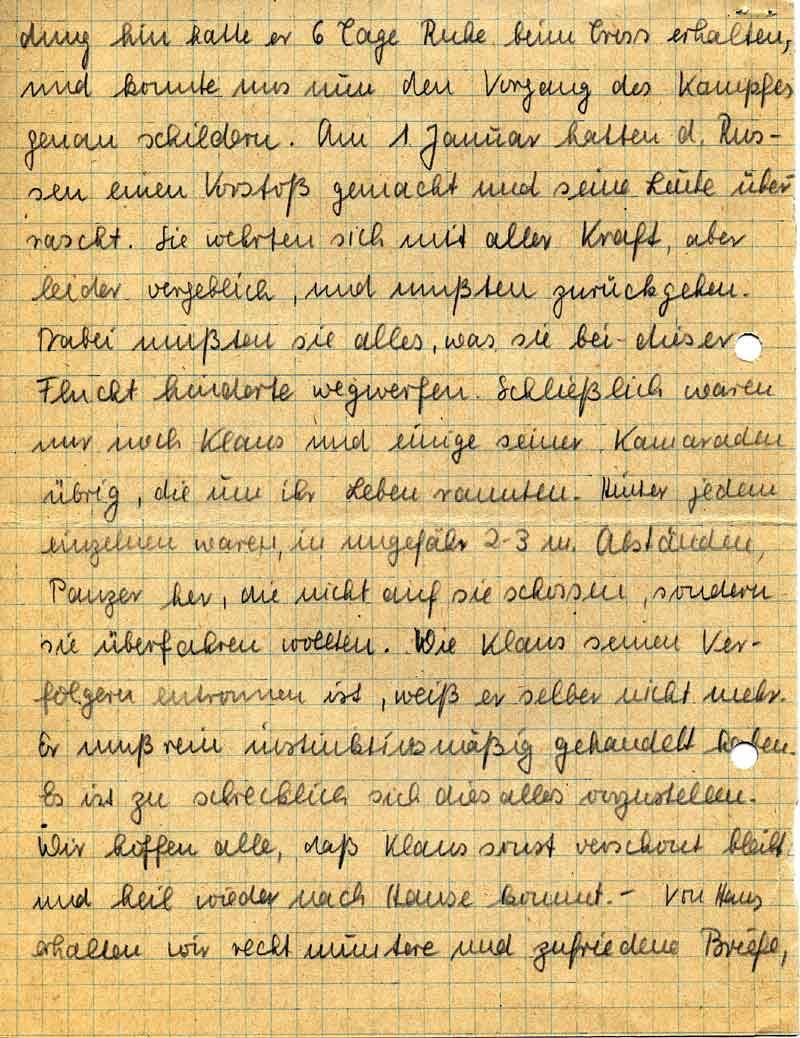 dung hin hatte er 6 Tage Ruhe beim Tross erhalten, und konnte uns nun den Vorgang des Kampfes genau schildern. Am 1. Januar hatten d. Russen einen Vorstoß gemacht und seine Leute überrascht. Sie wehrten sich mit aller Kraft, aber leider vergeblich, und mußten zurückgehen. Dabei mußten sie alles, was sie bei dieser Flucht hinderte wegwerfen. Schließlich waren nur noch Klaus und einige seiner Kameraden übrig, die um ihr Leben rannten. Hinter jedem einzelnen waren, in ungefähr 2-3 m. Abständen, Panzer her, die nicht auf sie schossen, sondern sie überfahren wollten. Wie Klaus seinen Verfolgern entronnen ist, weiß er selber nicht mehr. Er muß rein instinktivmäßig gehandelt haben. Es ist zu schrecklich sich dies alles vorzustellen. Wir hoffen alle, daß Klaus sonst verschont bleibt und heil wieder nach Hause kommt. – Von Hans erhalten wir recht muntere und zufriedene Briefe,