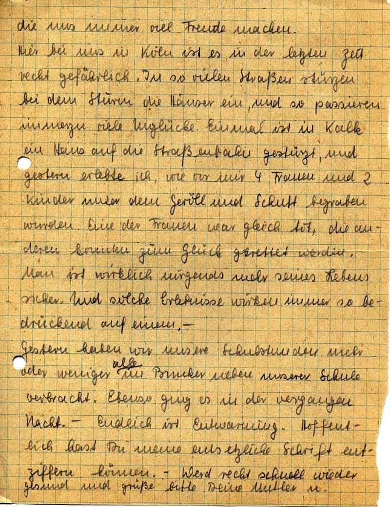 Hier bei uns in Köln ist es in der letzten Zeit recht gefährlich. In so vielen Straßen stürzen bei dem Sturm die Häuser ein, und so passieren immerzu viele Unglücke. Einmal ist in Kalk ein Haus auf die Straßenbahn gestürzt, und gestern erlebte ich, wie vor mir 4 Frauen und 2 Kinder unter dem Geröll und Schutt begraben wurden. Eine der Frauen war gleich tot, die anderen konnten zum Glück gerettet werden. Man ist wirklich nirgends mehr seines Lebens sicher. Und solche Erlebnisse wirken immer so bedrückend auf einen. -