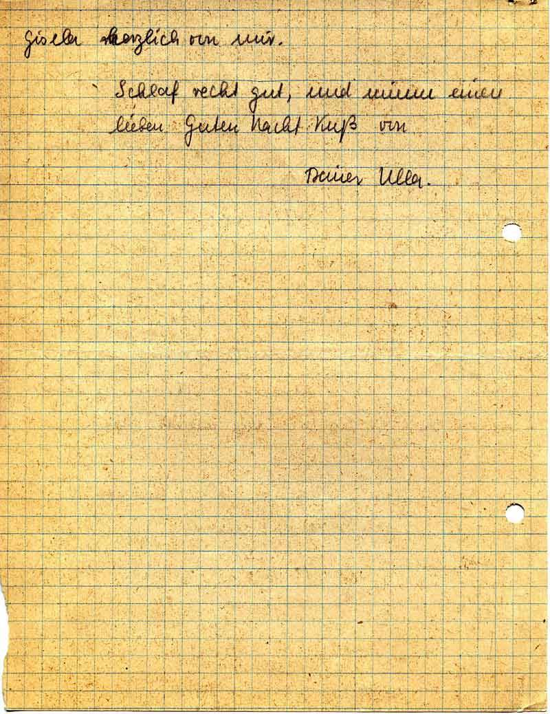 Gestern haben wir unsere Schulstunden mehr oder weniger alle im Bunker neben unserer Schule verbracht. Ebenso ging es in der vergangen Nacht. – Endlich ist Entwarnung. Hoffentlich hast Du meine entsetzliche Schrift entziffern können. – Werd recht schnell wieder gesund und grüße bitte Deine Mutter u.