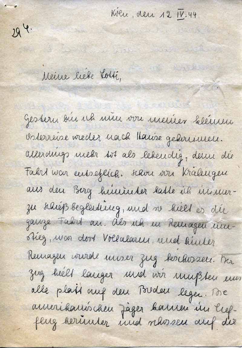 Gestern bin ich nun von meiner kleinen Osterreise wieder nach Hause gekommen. Allerdings mehr tot als lebendig, denn die Fahrt war entsetzlich. Schon von Krälingen aus den Berg hinunter hatte ich immerzu Schießbegleitung, und so hielt es die ganze Fahrt an. Als ich in Remagen umstieg, war dort Vollalarm und hinter Remagen wurde unser Zug beschossen. Der Zug hielt länger und wir mußten uns alle platt auf den Boden legen. Die amerikanischen Jäger kamen im Tiefflug herunter und schossen auf die