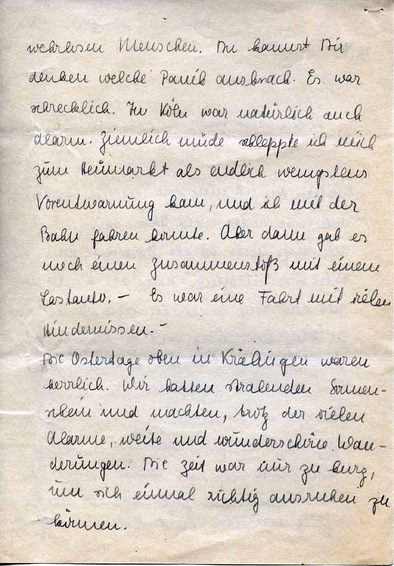 wehrlosen Menschen. Du kannst Dir denken welche Panik ausbrach. Es war schrecklich. In Köln war natürlich auch Alarm. Ziemlich müde schleppte ich mich zum Heumarkt als endlich wenigstens Vorentwarnung kam, und ich mit der Bahn fahren konnte. Aber dann gab es noch einen Zusammenstoß mit einem Lastauto. – Es war eine Fahrt mit vielen Hindernissen. -