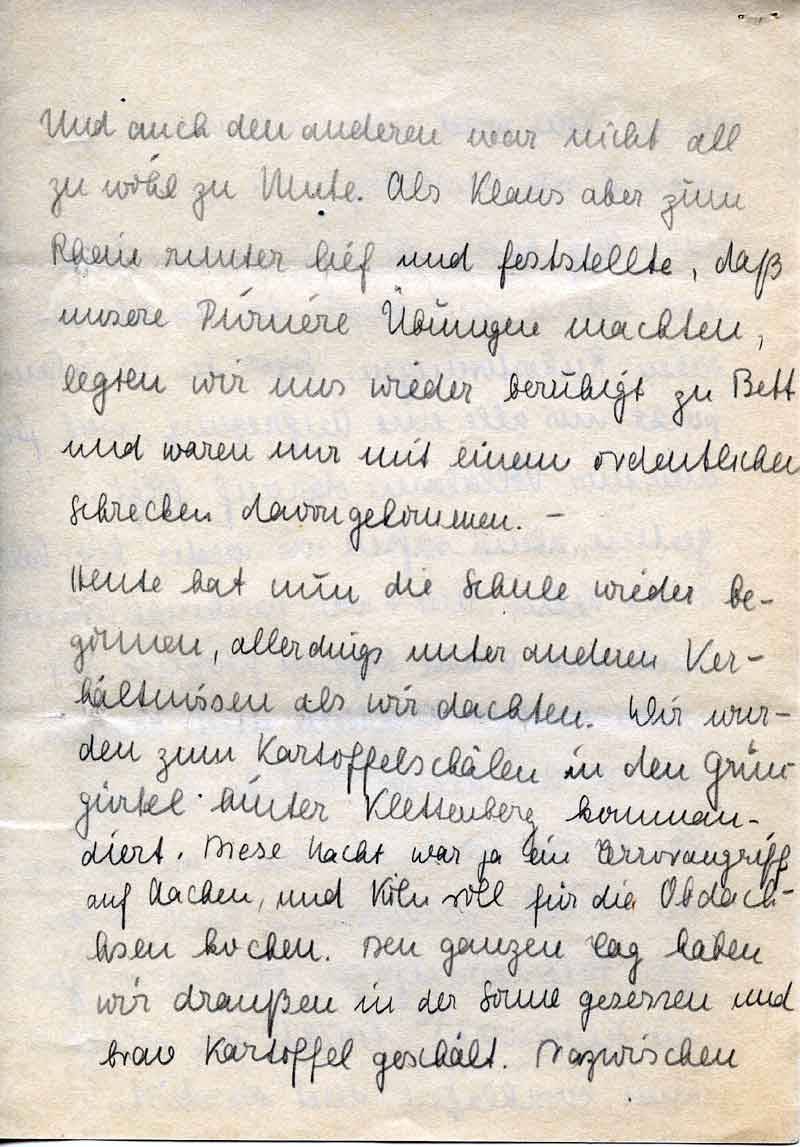 Heute hat nun die Schule wieder begonnen, allerdings unter anderen Verhältnissen als wir dachten. Wir wurden zum Kartoffelschälen in den Grüngürtel hinter Klettenberg kommandiert. Diese Nacht war ja ein Terrorangriff auf Aachen und Köln soll für die Obdachlosen kochen. Den ganzen Tag haben wir draußen in der Sonne gesessen und brav Kartoffel geschält. Dazwischen