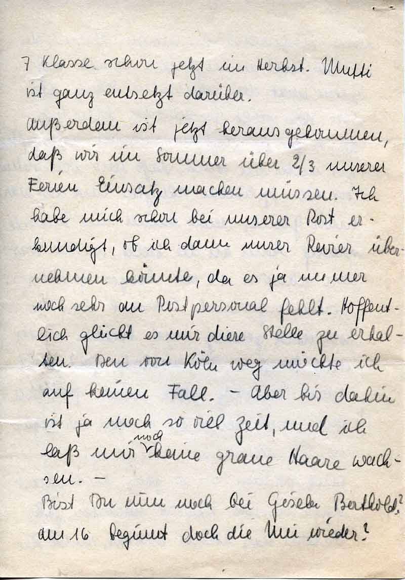 Außerdem ist jetzt herausgekommen, daß wir im Sommer über 2/3 unserer Ferien Einsatz machen müssen. Ich habe mich schon bei unserer Post erkundigt, ob ich dann unser Revier übernehmen könnte, da es ja immer noch sehr an Postpersonal fehlt. Hoffentlich glückt es mir diese Stelle zu erhalten. Den von Köln weg möchte ich auf keinen Fall. – Aber bis dahin ist ja noch so viel Zeit, und ich laß mir noch keine graue Haare wachsen. -