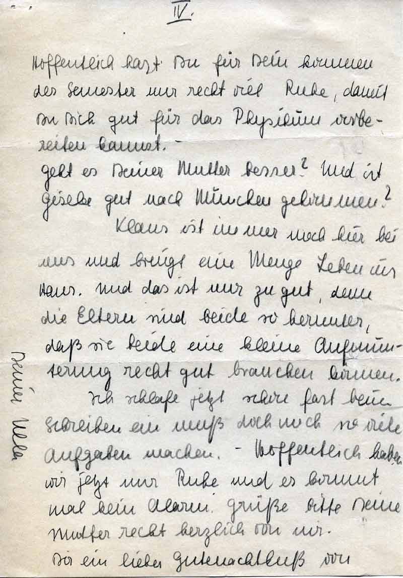 Ich schlafe jetzt schon fast beim Schreiben ein muß doch noch so viele Aufgaben machen. – Hoffentlich haben wir jetzt nur Ruhe und es kommt mal kein Alarm. Grüße bitte Deine Mutter recht herzlich von mir.