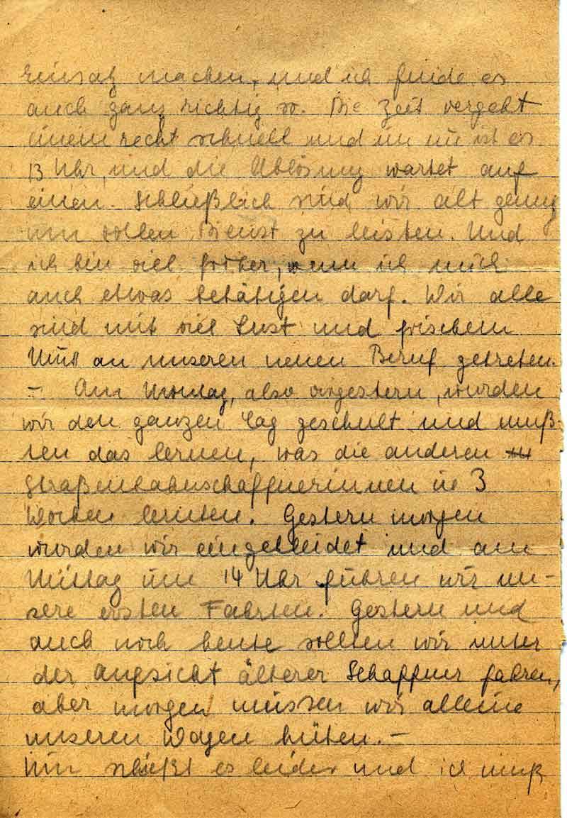 Einsatz machen, und ich finde es auch ganz richtig so. Die Zeit vergeht einem recht schnell und im nu ist es 13 Uhr, und die Ablösung wartet auf einen. Schließlich sind wir alt genug um vollen Dienst zu leisten. Und ich bin viel froher, wenn ich mich auch etwas betätigen darf. Wir alle sind mit viel Lust und frischem Mut an unseren neuen Beruf getreten. – Am Montag, also vorgestern, wurden wir den ganzen Tag geschult und mußten das lernen, was die anderen Straßenbahnschaffnerinnen in 3 Wochen lernen. Gestern morgen wurden wir eingekleidet und am Mittag um 14 Uhr fuhren wir unsere ersten Fahrten. Gestern und auch noch heute sollten wir unter der Aufsicht älterer Schaffner fahren, aber morgen müssen wir alleine unseren Wagen hüten. -
