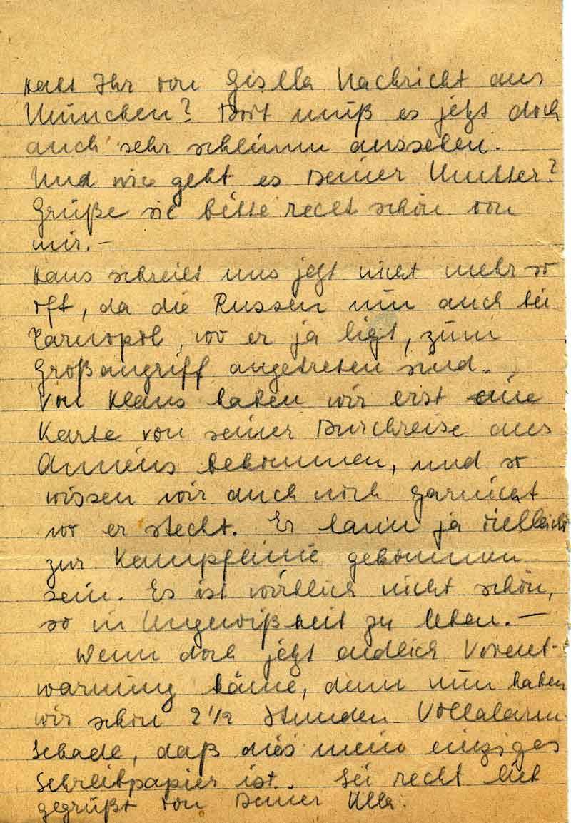 Wenn doch jetzt endlich Vorentwarnung käme, denn nun haben wir schon 2 ½ Stunden Vollalarm. Schade, daß dies mein einziges Schreibpapier ist. Sei recht lieb gegrüßt von Deiner Ulla.