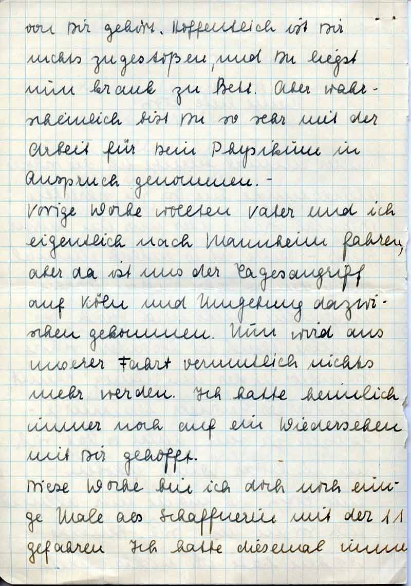 Vorige Woche wollten Vater und ich eigentlich nach Mannheim fahren, aber da ist uns der Tagesangriff auf Köln und Umgebung dazwischen gekommen. Nun wird aus unserer Fahrt vermutlich nichts mehr werden. Ich hatte heimlich immer noch auf ein Wiedersehen mit Dir gehofft.