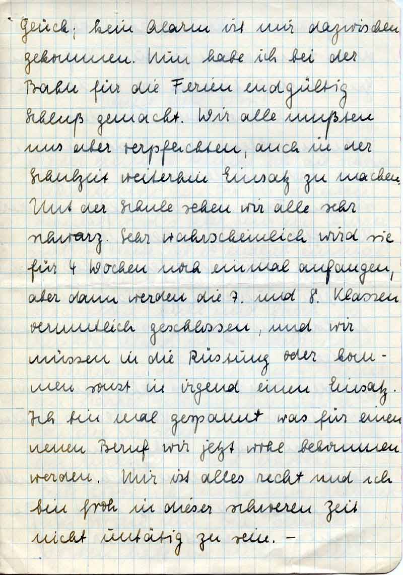 Glück; kein Alarm ist mir dazwischen gekommen. Nun habe ich bei der Bahn für die Ferien endgültig Schluß gemacht. Wir alle mußten uns aber verpflichten, auch in der Schulzeit weiterhin Einsatz zu machen. Mit der Schule sehen wir alle sehr schwarz. Sehr wahrscheinlich wird sie für 4 Wochen noch einmal anfangen, aber dann werden die 7. und 8. Klassen vermutlich geschlossen, und wir müssen in die Rüstung oder kommen sonst in irgend einen Einsatz. Ich bin mal gespannt was für einen neuen Beruf wir jetzt wohl bekommen werden. Mir ist alles recht und ich bin froh in dieser schweren Zeit nicht untätig zu sein. –