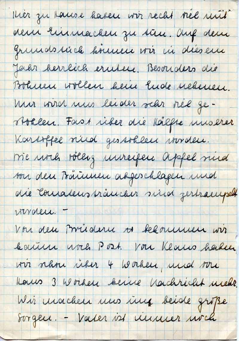 Von den Brüdern bekommen wir kaum noch Post. Von Klaus haben wir schon über 4 Wochen, und von Hans 3 Wochen keine Nachricht mehr. Wir machen uns um beide große Sorgen. – Vater ist immer noch
