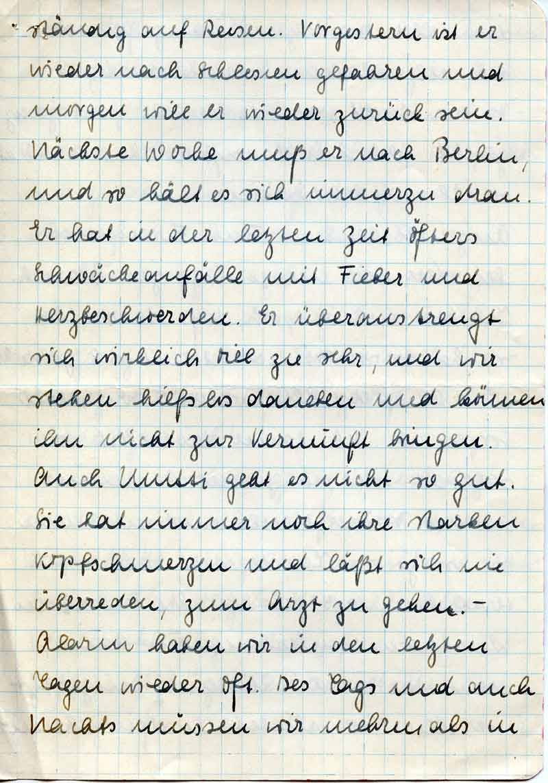 ständig auf Reisen. Vorgestern ist er wieder nach Schlesien gefahren und morgen will er wieder zurück sein. Nächste Woche muß er nach Berlin, und so hält es sich immerzu dran. Er hat in der letzten Zeit öfters Schwächeanfälle mit Fieber und Herzbeschwerden. Er überanstrengt sich wirklich viel zu sehr, und wir stehen hilflos daneben und können ihn nicht zur Vernunft bringen. Auch Mutti geht es nicht so gut. Sie hat immer noch ihre starken Kopfschmerzen und läßt sich nie überreden, zum Arzt zu gehen. -