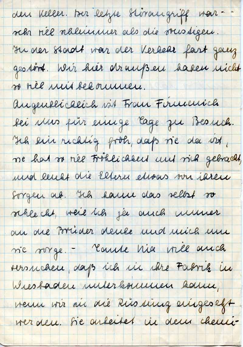Augenblicklich ist Frau Firmenich bei uns für einige Tage zu Besuch. Ich bin richtig froh, daß sie da ist, sie hat so viel Fröhlichkeit mit sich gebracht, und lenkt die Eltern etwas von ihren Sorgen ab. Ich kann das selbst so schlecht, weil ich ja auch immer an die Brüder denke und mich um sie sorge. – Tante Nia will auch versuchen, daß ich in ihre Fabrik in Wiesbaden unterkommen kann, wenn wir in die Rüstung eingesetzt werden. Sie arbeitet in dem chemi-