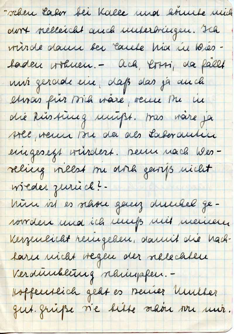 schen Labor bei Kalle und könnte mich dort vielleicht auch unterbringen. Ich würde dann bei Tante Nia in Wiesbaden wohnen. – Ach, Lotti, da fällt mir gerade ein, daß das ja auch etwas für Dich wäre, wenn Du in die Rüstung mußt. Das wäre ja toll, wenn Du da als Laborantin eingesetzt würdest. Denn nach Wesseling willst Du doch gewiß nicht wieder zurück? -