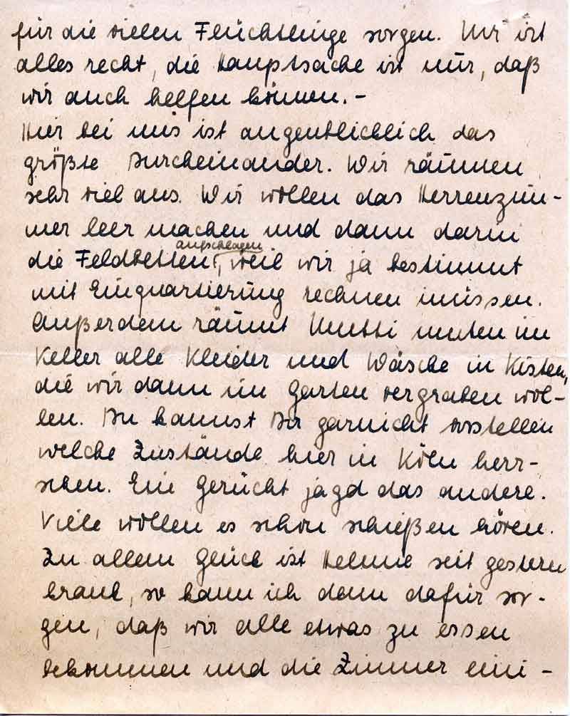 Hier bei uns ist augenblicklich das größte Durcheinander. Wir räumen sehr viel aus. Wir wollen das Herrenzimmer leer machen und dann darin die Feldbetten aufschlagen, weil wir ja bestimmt mit Einquartierung rechnen müssen. Außerdem räumt Mutti unten im Keller alle Kleider und Wäsche in Kisten, die wir dann im Garten vergraben wollen. Du kannst Dir garnicht vorstellen welche Zustände hier in Köln herrschen. Ein Gerücht jagd das andere. Viele wollen es schon schießen hören. Zu allem Glück ist Helmie seit gestern krank, so kann ich dann dafür sorgen, daß wir alle etwas zu essen bekommen und die Zimmer eini-