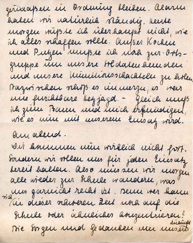 germaßen in Ordnung bleiben. Alarm haben wir natürlich ständig. Heute morgen wußte ich überhaupt nicht, wie ich alles schaffen sollte. Außer Kochen und Putzen mußte ich noch zur Ortsgruppe um unsere Soldatenhemden und unsere Munitionsschachteln zu holen. Dazwischen schoß es immerzu, es war eine furchtbare Hetzjagd. – Gleich muß ich zum Bann und mich erkundigen, wie es nun mit unserem Einsatz wird.