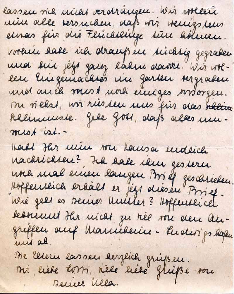 Habt Ihr nun von Hansa endlich Nachrichten? Ich habe ihm gestern noch mal einen langen Brief geschrieben. Hoffentlich erhält er jetzt diesen Brief. Wie geht es Deiner Mutter? Hoffentlich bekommt Ihr nicht zu viel von den Angriffen auf Mannheim-Ludwigshafen mit ab.