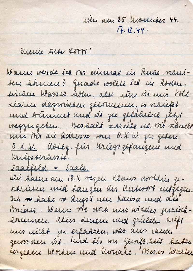 Wann werde ich Dir einmal in Ruhe schreiben können? Gerade wollte ich in Rodenkirchen Wasser holen, aber nun ist mir Vollalarm dazwischen gekommen, es schießt und brummt und ist zu gefährlich jetzt wegzugehen. Deshalb schreibe ich Dir schnell um Dir die Adresse vom O.K.W. zu geben.