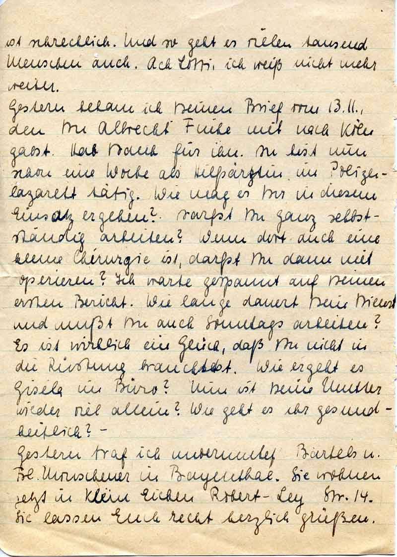 Gestern bekam ich Deinen Brief vom 13.11., den Du Albrecht Finke mit nach Köln gabst. Hab Dank für ihn. Du bist nun schon eine Woche als Hilfsärztin im Polizeilazarett tätig. Wie mag es Dir in diesem Einsatz ergehen? Darfst Du ganz selbständig arbeiten? Wenn dort auch eine kleine Chirurgie ist, darfst Du dann mit operieren? Ich warte gespannt auf Deinen ersten Bericht. Wie lange dauert Dein Dienst und mußt Du auch Sonntags arbeiten? Es wirklich ein Glück, daß Du nicht in die Rüstung brauchtest. Wie ergeht es Gisela im Büro? Nun ist Deine Mutter wieder viel allein? Wie geht es ihr gesundheitlich? -