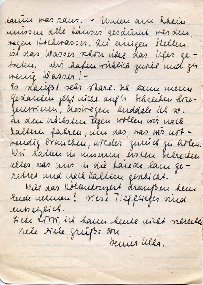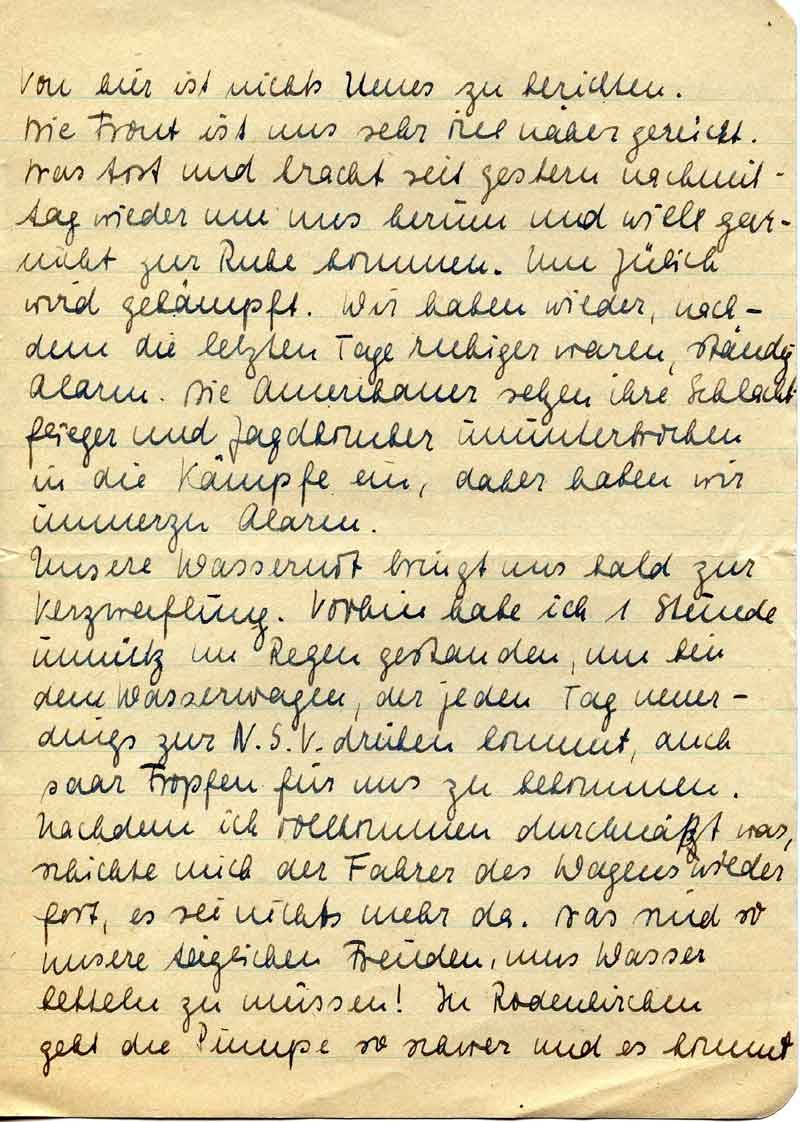 Unsere Wassernot bringt uns bald zu Verzweiflung. Vorhin habe ich 1 Stunde unnütz im Regen gestanden, um hier dem Wasserwagen, der jeden Tag neuerdings zur N.S.V. drüben kommt, auch paar Tropfen für uns zu bekommen. Nachdem ich vollkommen durchnäßt war, schickte mich der Fahrer des Wagens wieder fort, es sei nichts mehr da. Das sind so unsere täglichen Freuden, ums Wasser betteln zu müssen! In Rodenkirchen geht die Pumpe so schwer und es kommt