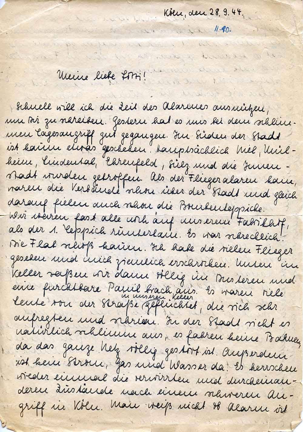 Schnell will ich die Zeit des Alarmes ausnützen, um Dir zu schreiben. Gestern hat es uns bei dem schlimmen Tagesangriff gut gegangen. Im Süden der Stadt isst kaum etwas geschehen. Hauptsächlich Niel, Mülheim, Lindental, Ehrenfeld, Sülz und die Innenstadt wurden getroffen. Als der Fliegeralarm kam, waren die Verbände schon über der Stadt und gleich darauf fielen auch schon die Bomenteppiche.