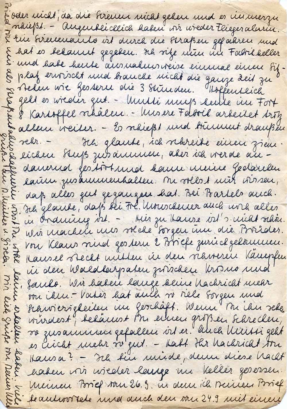 oder nicht, da die Sirenen nicht gehen und es immerzu schießt. – Augenblicklich haben wir wieder Fliegeralarm. Ein Sirenenauto ist durch die Straßen gefahren und hat es bekannt gegeben. Ich sitze nun im Fabrikkeller und habe heute ausnahmsweise einmal einen Sitzplatz erwischt und brauche nicht die ganze Zeit zu stehen wie Gestern die 3 Stunden. Hoffentlich geht es wieder gut. – Mutti muß heute im Fort 8 Kartoffel schälen. – Unsere Fabrik arbeitet trotz allem weiter. – Es schießt und brummt draußen sehr. – Ich glaube, ich schreibe einen ziemlichen Stuß zusammen, aber ich werde andauernd gestört und kann meine Gedanken kaum zusammenhalten. Du sollst nur wissen, daß alles gut gegangen ist. Bei Bartels auch. Ich glaube, daß bei Frl. Monscheuer auch noch alles in Ordnung ist. – Hier zu Hause ist’s nicht schön. Wir machen uns solche Sorgen um die Brüder. Von Klaus sind gestern 2 Briefe zurückgekommen. Hansel steckt mitten in den schweren Kämpfen in den Waldkarpaten zwischen Krosno und Sanko. Wir haben lange keine Nachricht mehr von ihm. – Vater hat auch so viele Sorgen und Schwierigkeiten im Geschäft. Wenn Du ihn sehen würdest, bekämst Du einen großen Schrecken, so zusammengefallen ist er. Auch Mutti geht es nicht mehr so gut. – Habt Ihr Nachricht von Hansa? – Ich bin müde, denn diese Nacht haben wir wieder lange im Keller gesessen. Meinen Brief vom 26.9. in dem ich Deinen Brief beantwortete und auch den vom 24.9. mit einem Bild von mir als Straßenbahnschaffnerin wirst Du wohl kaum erhalten haben. Viele Grüße an D. Mutter u. Gisela. Dir liebe Grüße von Deiner Ulla.