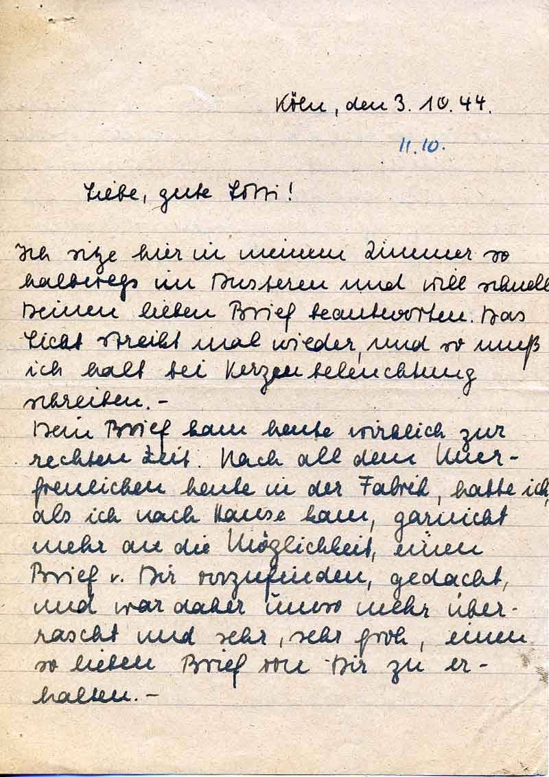 Ich sitze hier in meinem Zimmer so halbwegs im Dusteren und will schnell Deinen lieben Brief beantworten. Das Licht streikt mal wieder, und so muß ich halt bei Kerzenbeleuchtung schreiben. -